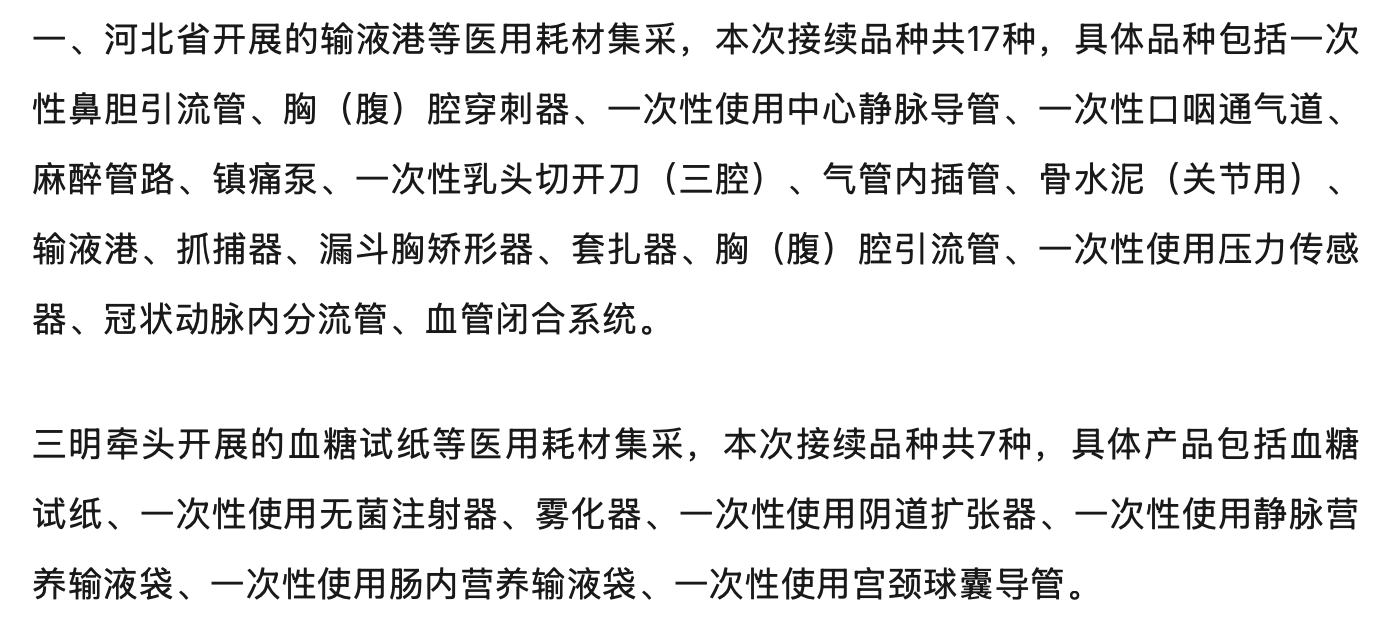 此次接續(xù)共涉及兩批醫(yī)用耗材集采項(xiàng)目,包括河北省輸液港等耗材集采(本次接續(xù)品種共17種)與三明牽頭的血糖試紙等耗材集采(本次接續(xù)品種共7種),具體品種如下: