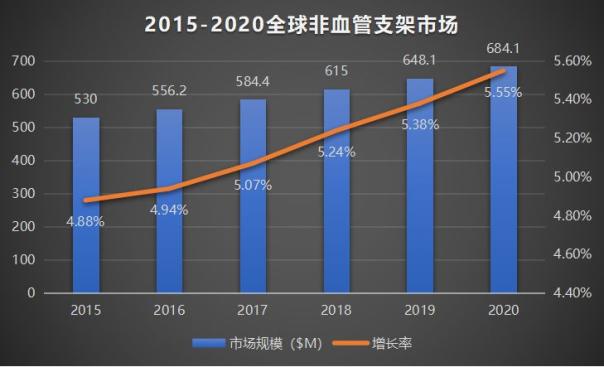 根據(jù)美國(guó)第三方市場(chǎng)研究機(jī)構(gòu)Technavio發(fā)布的《2016-2020全球非血管支架市場(chǎng)報(bào)行情》,全球非血管支架市場(chǎng)在2015年達(dá)到了大約5.3億美元,預(yù)計(jì)到2020年,這一市場(chǎng)將以5.24%的年復(fù)合增長(zhǎng)率增長(zhǎng)到6.841億美元,并且市場(chǎng)增速還將從2015年的4.88%上升到2020年的5.55%。