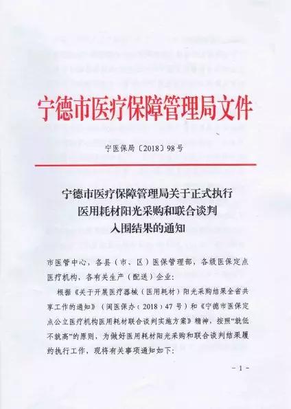 10月26日,福建省寧德市醫(yī)療保障管理局印發(fā)《寧德市醫(yī)療保障管理局關(guān)于正式執(zhí)行醫(yī)療耗材陽光采購和聯(lián)合談判入圍結(jié)果的通知》(下稱《通知》),開始對此前耗材聯(lián)合談判的第一批入圍結(jié)果正式執(zhí)行,執(zhí)行時間自2018年11月1日起,過渡期一個月。
