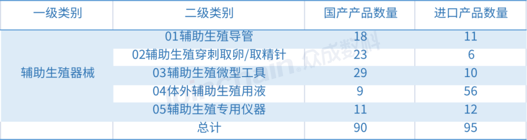 據(jù)眾成數(shù)科統(tǒng)計,截止到2022年4月30日,我國輔助生殖器械的有效注冊產(chǎn)品數(shù)為185件,國產(chǎn)產(chǎn)品90件,進口產(chǎn)品95件。其中輔助生殖導管29件,輔助生殖穿刺取卵/取精針29件,輔助生殖微型工具39件,體外輔助生殖用液65件,輔助生殖專用儀器23件。