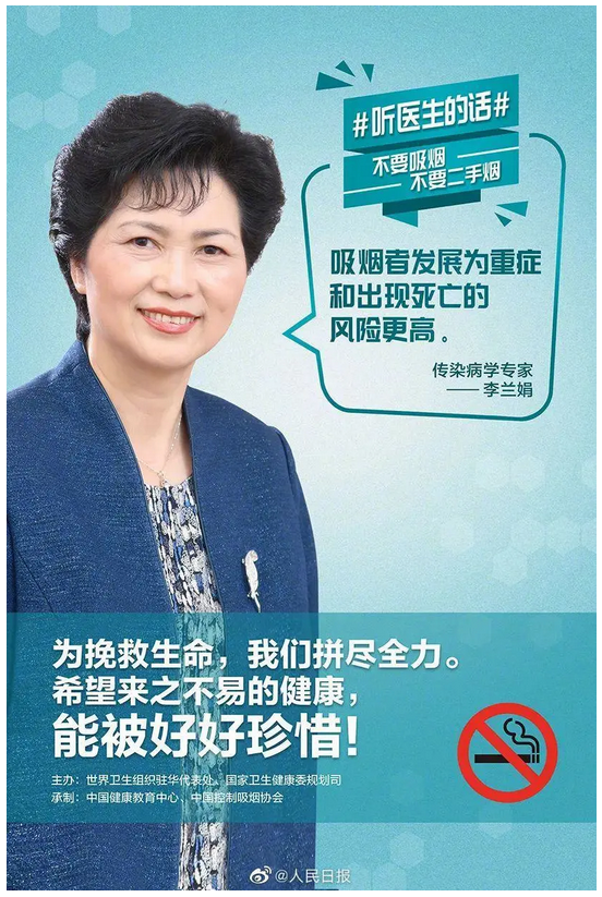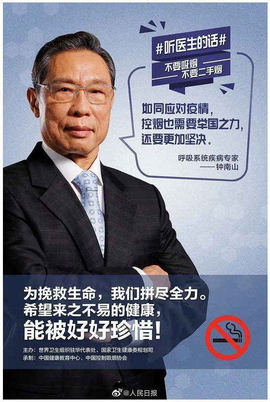 其中,鐘南山院士表示:" 如同應(yīng)對疫情,控?zé)熞残枰e國之力,還要更加堅(jiān)決 "。李蘭娟、王辰等醫(yī)生也呼吁倡導(dǎo)聽醫(yī)生的話,不吸煙、不要二手煙。