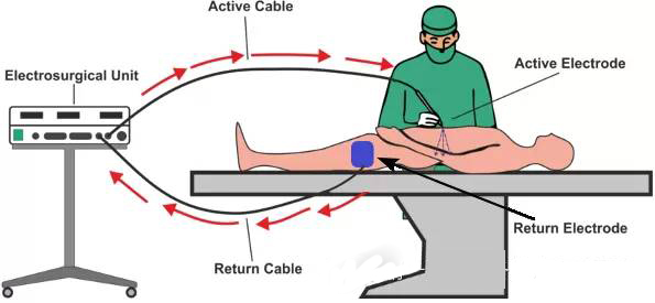 高頻電刀手術(shù)中,電流是從刀筆流入人體,然后在負(fù)極板流出。如下圖