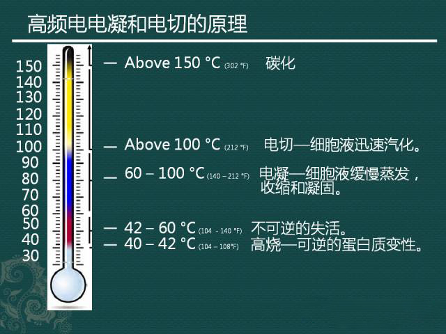 高頻電主要是在病灶局部產(chǎn)生相應(yīng)頻率的電壓和電流,而其最本質(zhì)的區(qū)別在于熱效應(yīng)的溫度不同。相對(duì)高的溫度可以形成切割的效果,而相對(duì)低的溫度(仍然相對(duì)較高)可以實(shí)現(xiàn)電凝的效果,兩者的根本原理都是高頻電產(chǎn)生的熱效應(yīng)。