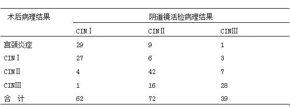 表 1 Leep刀切除組織與陰道鏡活檢病理結(jié)果(n)