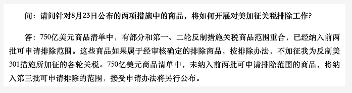 同時(shí),文件指出,國務(wù)院關(guān)稅稅則委員會(huì)將繼續(xù)開展對(duì)美加征關(guān)稅商品排除工作,適時(shí)公布后續(xù)批次排除清單。