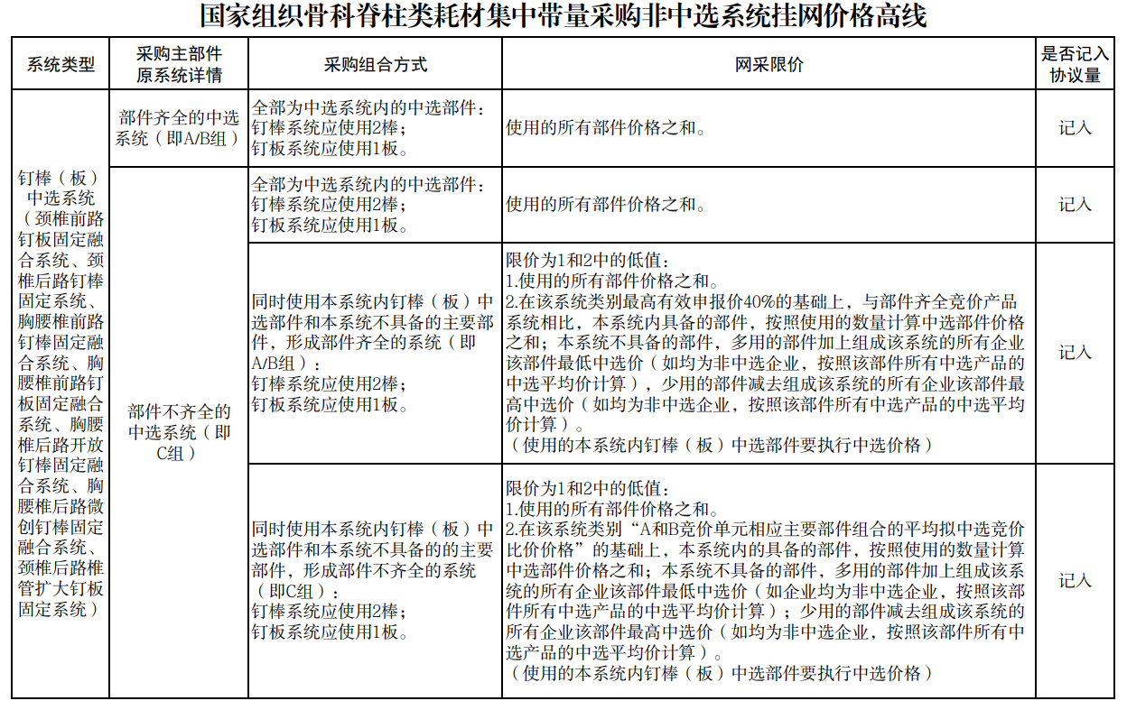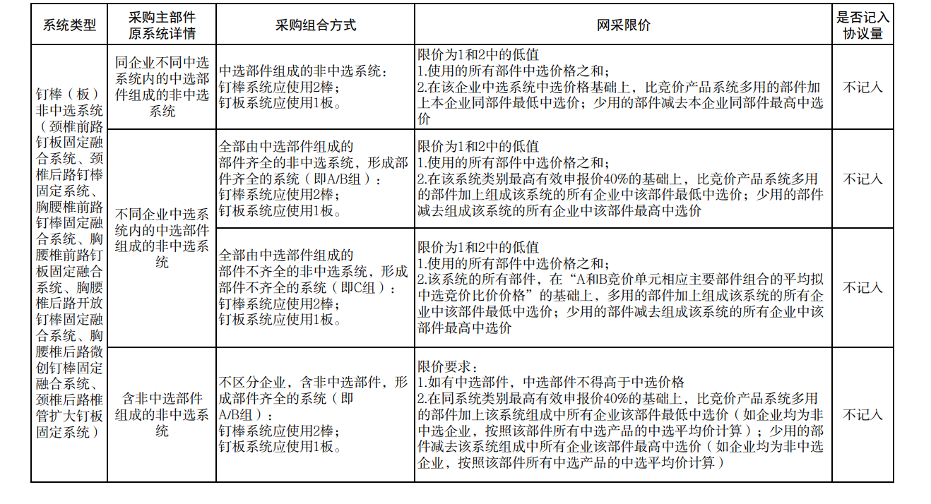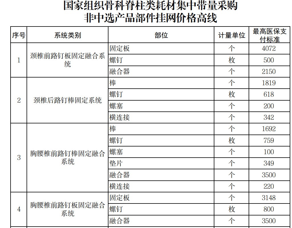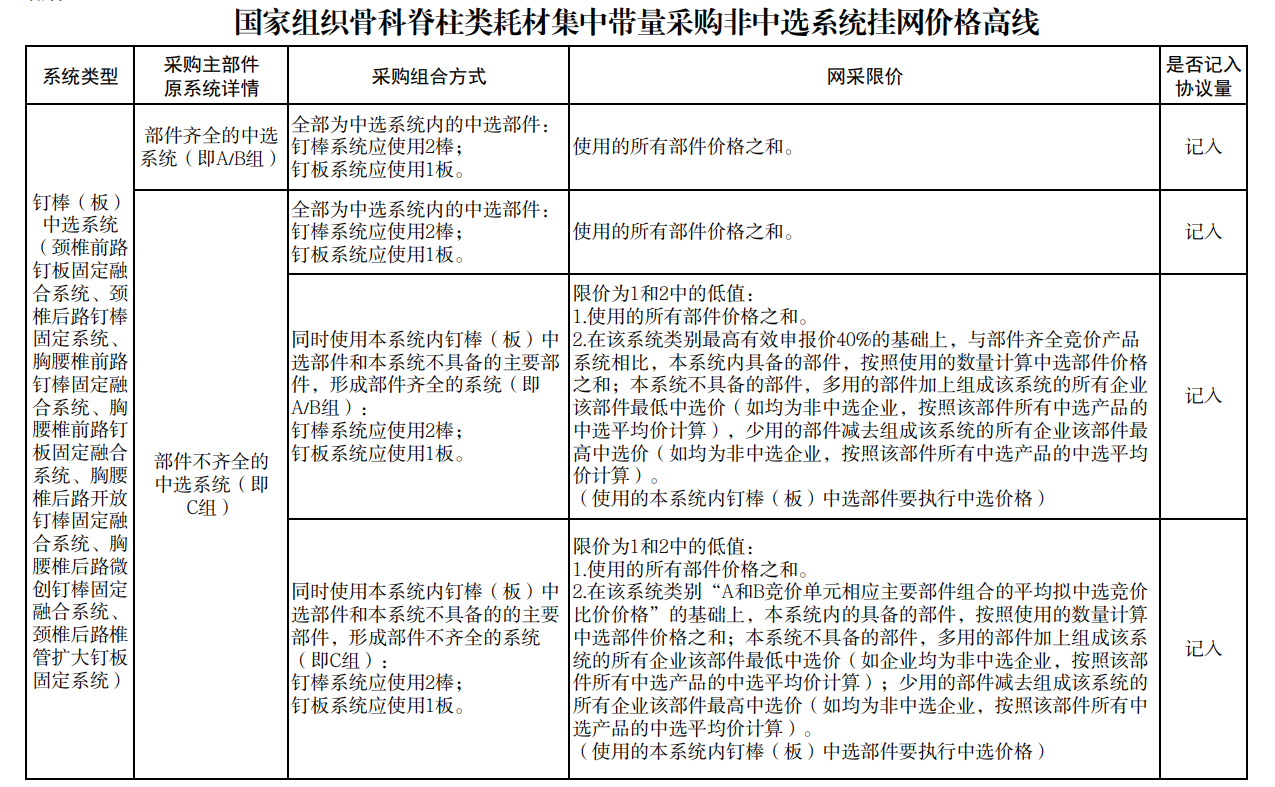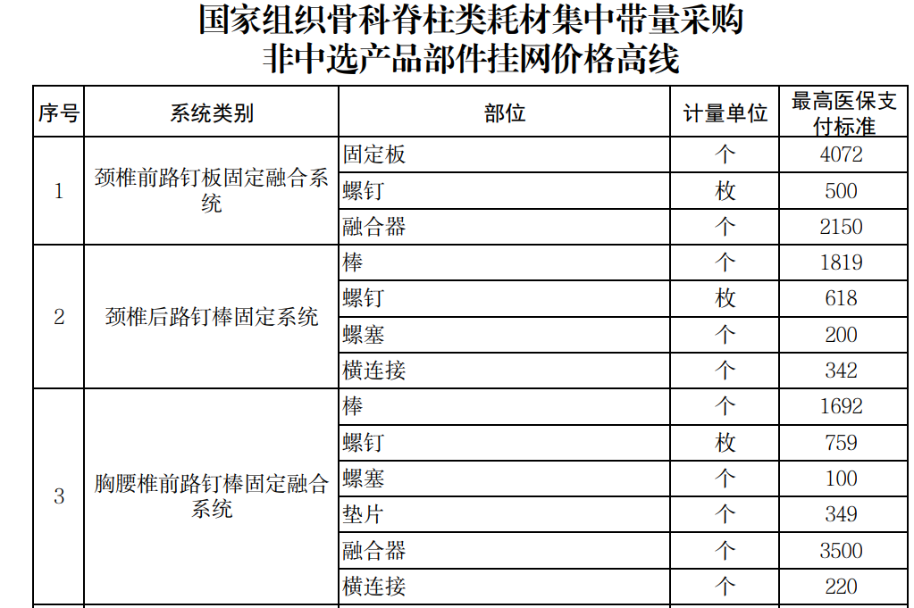各中選企業(yè)的非中選產(chǎn)品系統(tǒng)中包含中選產(chǎn)品系統(tǒng)部件的,按不高于該部件的中選價(jià)格掛網(wǎng);如非中選脊柱產(chǎn)品各部件均由中選產(chǎn)品系統(tǒng)的不同部件組成,則總價(jià)按實(shí)際使用部件折算成中選產(chǎn)品系統(tǒng)價(jià)格后,不得高于同企業(yè)同類(lèi)別中選產(chǎn)品價(jià)格。其他非中選產(chǎn)品系統(tǒng)及部件分別設(shè)定掛網(wǎng)價(jià)格高線(xiàn)。