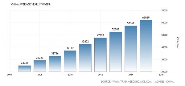 中國(guó)平均年薪,2006-2015。單位:人民幣