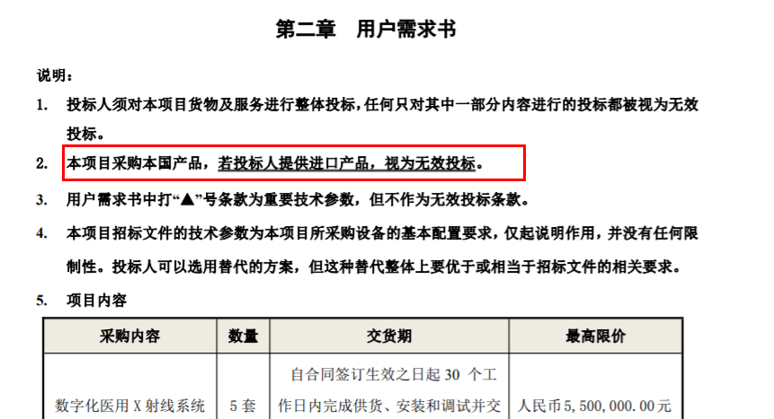 值得關(guān)注的是,南雄市衛(wèi)生健康局公布的招標(biāo)文件中,直接表明僅采購(gòu)本國(guó)產(chǎn)品,若投標(biāo)人提供進(jìn)口產(chǎn)品,視為無(wú)效投標(biāo)。