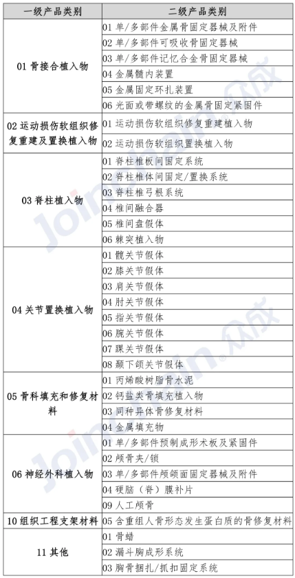 按照產品的功能和臨床使用分類,一級類別產品主要有骨接合植入物、運動損傷軟組織修復重建及置換植入物、脊柱植入物、關節(jié)置換植入物、骨科填充與修復材料以及少部分神經外科植入物、組織工程支架材料與其他特殊應用材料。
