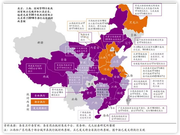 據(jù)光大證券梳理了全國耗材兩票制和耗材零加成的進(jìn)展情況,根據(jù)光大證券信息,全國多省已開始或全面實(shí)施耗材兩票制。