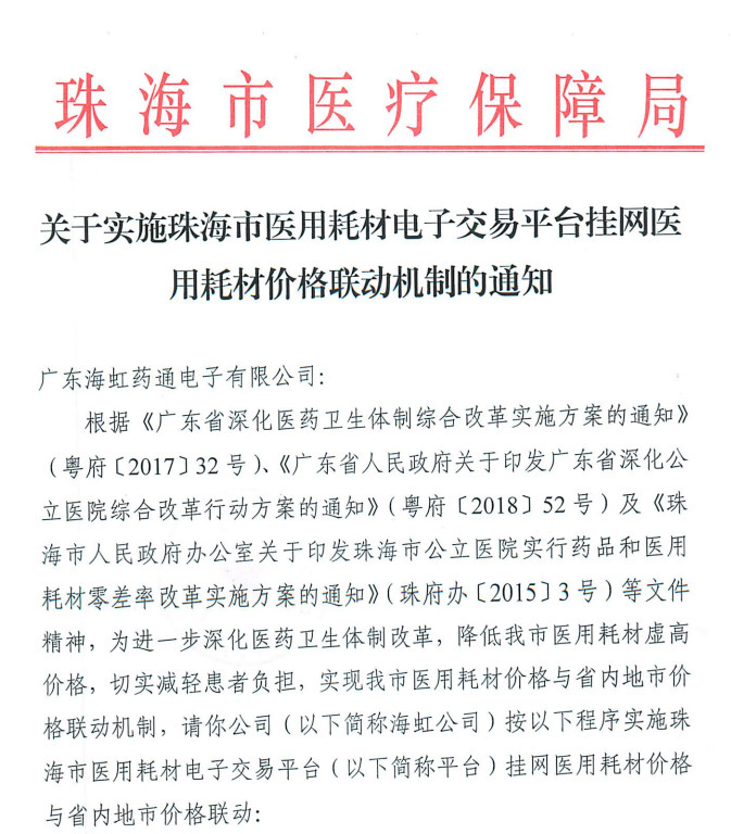 1月29日,珠海市醫(yī)療保障局印發(fā)《關(guān)于實施珠海市醫(yī)用耗材電子交易平臺掛網(wǎng)醫(yī)用耗材價格聯(lián)動機制的通知》(以下稱《通知》),直接發(fā)文對象是廣東海虹藥通電子商務(wù)有限公司(即珠海市醫(yī)用耗材電子交易平臺),要求掛網(wǎng)醫(yī)用耗材價格與廣東省內(nèi)地市價格聯(lián)動,取兩年內(nèi)最低中標(biāo)價格,直接與之調(diào)平。