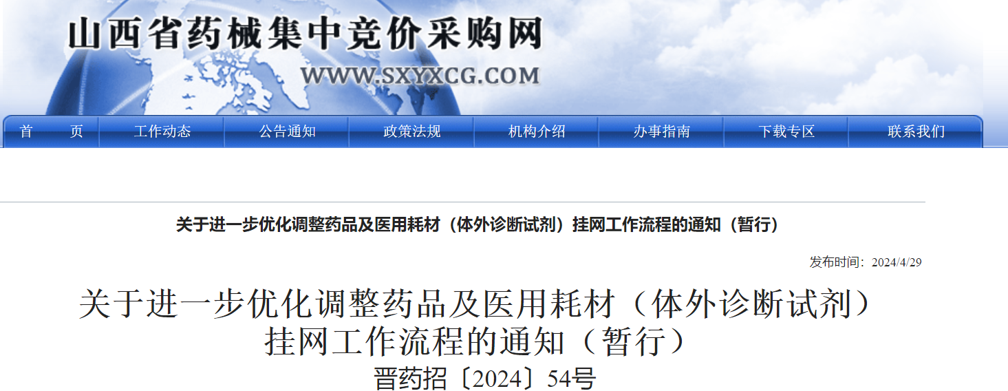 4月29日,山西省藥械集中招標(biāo)采購中心發(fā)布《關(guān)于進一步優(yōu)化調(diào)整藥品及醫(yī)用耗材(體外診斷試劑)掛網(wǎng)工作流程的通知(暫行)》(簡稱《通知》),自2024年5月1日起正式執(zhí)行。