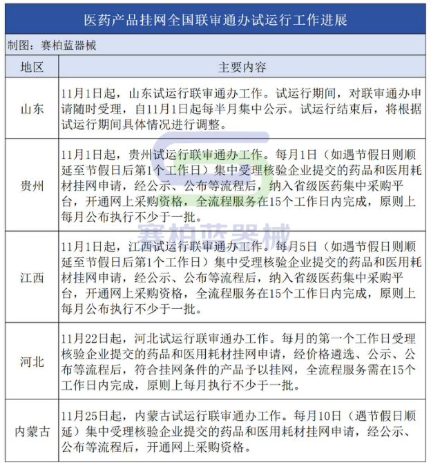 醫(yī)藥產(chǎn)品掛網(wǎng)全國聯(lián)審?fù)ㄞk試運(yùn)行工作進(jìn)展及各地受理時(shí)間安排如下: