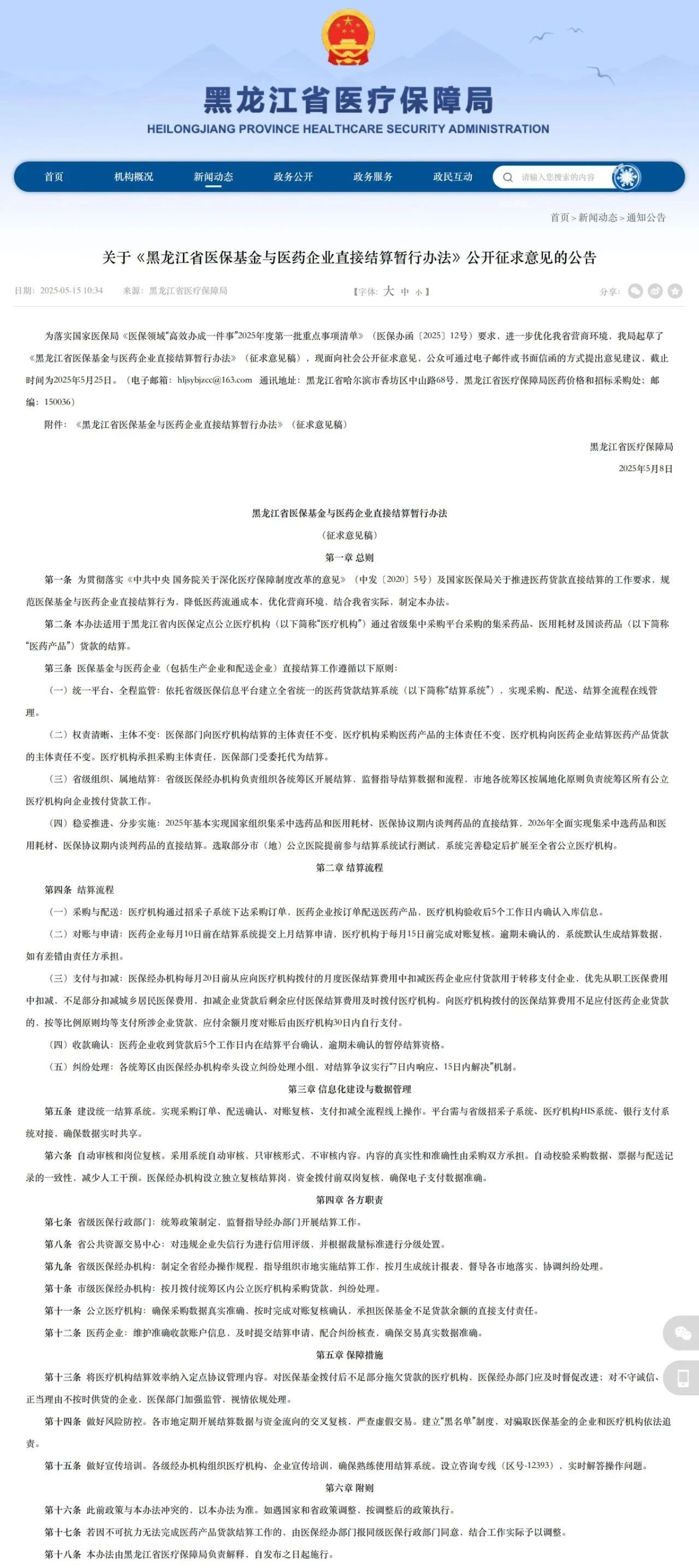 今日(5月15日),黑龍江醫(yī)保局官網(wǎng)發(fā)布《黑龍江省醫(yī)?;鹋c醫(yī)藥企業(yè)直接結(jié)算暫行辦法》(完整見(jiàn)文末)。