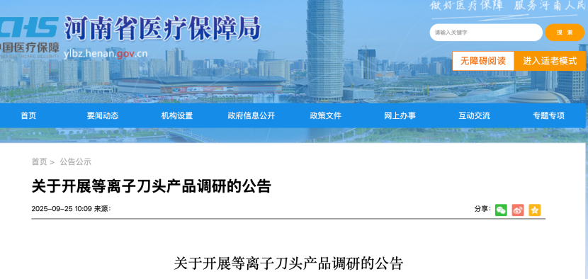 9月25日,河南醫(yī)保局發(fā)布《關(guān)于開展等離子刀頭產(chǎn)品調(diào)研的公告》。