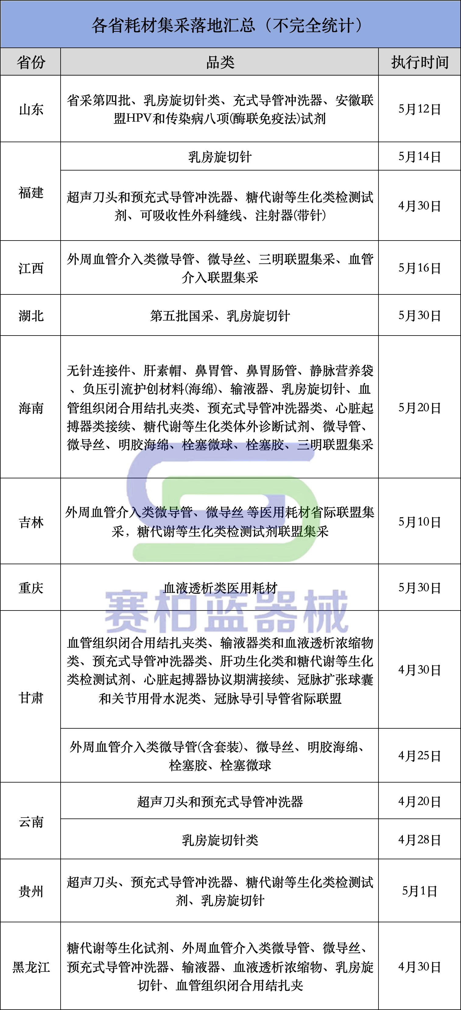在各類新集采密集啟動的同時,已成完成的大規(guī)模聯(lián)盟集采正在密集落地。據(jù)賽柏藍器械不完全統(tǒng)計,僅4-5月就有超30類耗材執(zhí)行/將執(zhí)行新價格。具體如下: