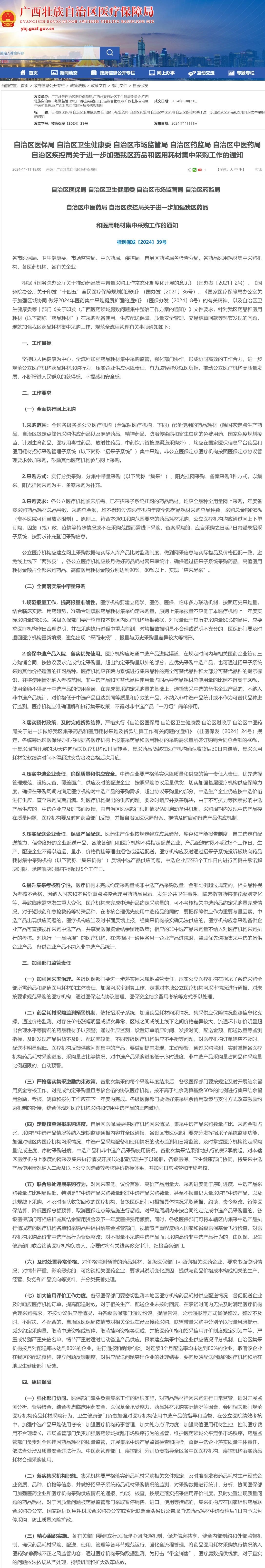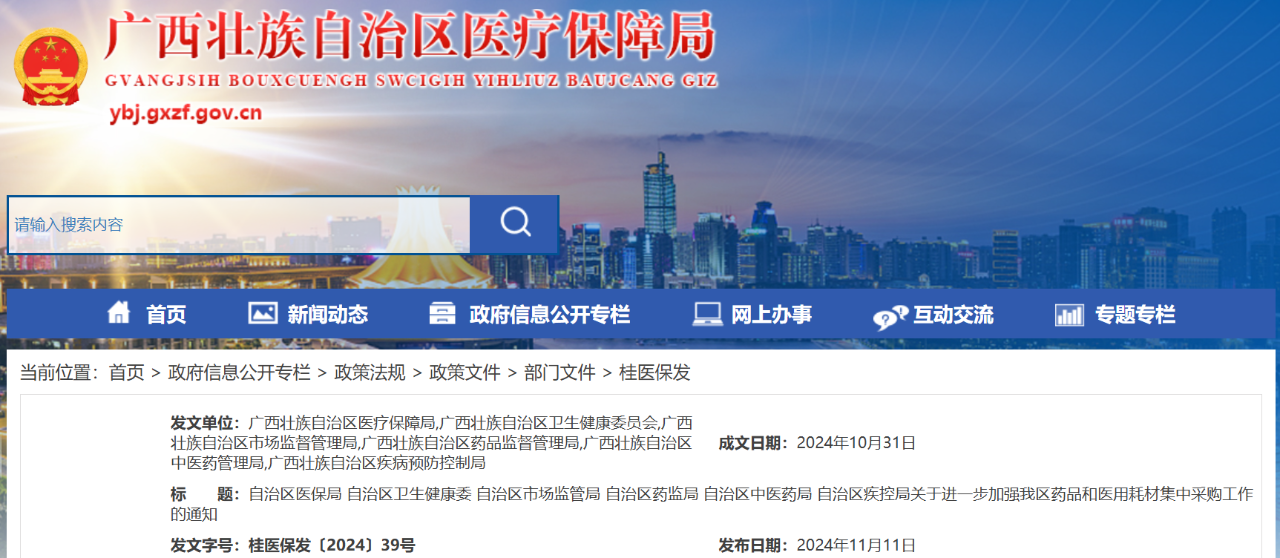 11月11日,廣西醫(yī)保局發(fā)布《自治區(qū)醫(yī)保局 自治區(qū)衛(wèi)生健康委 自治區(qū)市場監(jiān)管局 自治區(qū)藥監(jiān)局 自治區(qū)中醫(yī)藥局 自治區(qū)疾控局關(guān)于進(jìn)一步加強(qiáng)我區(qū)藥品和醫(yī)用耗材集中采購工作的通知》(完整附文末)。