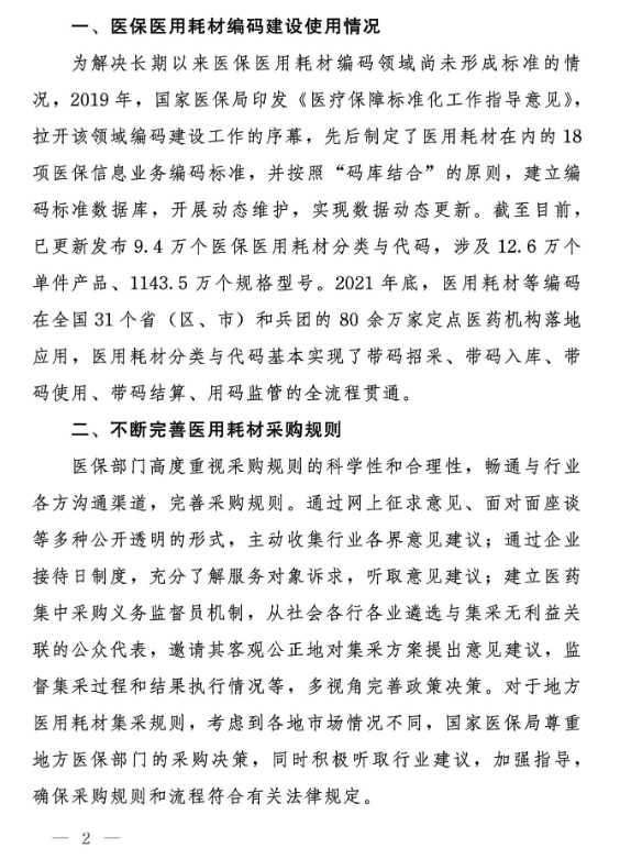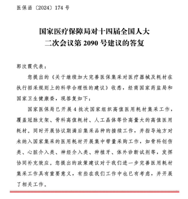 近日,國(guó)家醫(yī)保局發(fā)布《國(guó)家醫(yī)療保障局對(duì)十四屆全國(guó)人大二次會(huì)議第2090號(hào)建議的答復(fù)》(以下簡(jiǎn)稱《答復(fù)》),在《答復(fù)》中,國(guó)家醫(yī)保局說(shuō)明了耗材集采規(guī)則及創(chuàng)新醫(yī)療器械落地使用的下一步工作考慮。