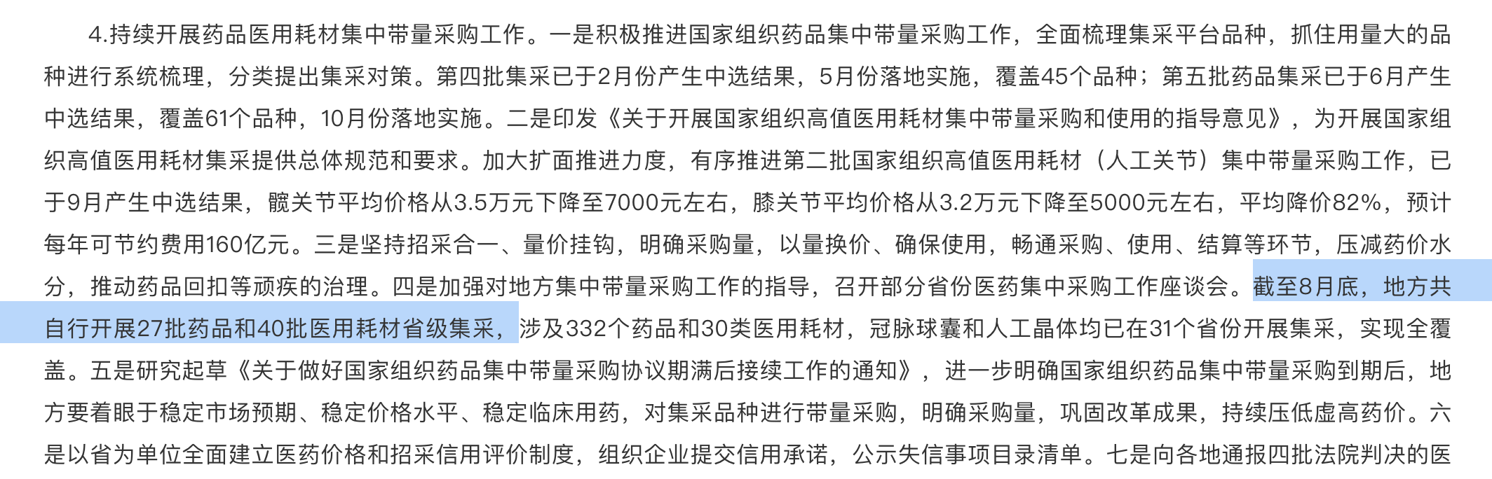 此外,國(guó)家醫(yī)保局加強(qiáng)對(duì)地方集中帶量采購(gòu)工作的指導(dǎo)。截至8月底,地方共自行開展27批藥品和40批醫(yī)用耗材省級(jí)集采,涉及332個(gè)藥品和30類醫(yī)用耗材。其中,冠脈球囊和人工晶體均已在31個(gè)省份開展集采,實(shí)現(xiàn)全覆蓋。