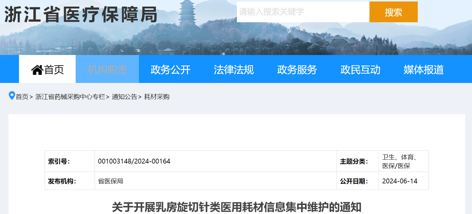 近日,浙江醫(yī)保局發(fā)布《關(guān)于開(kāi)展乳房旋切針類(lèi)醫(yī)用耗材信息集中維護(hù)的通知》(簡(jiǎn)稱(chēng)《通知》)。