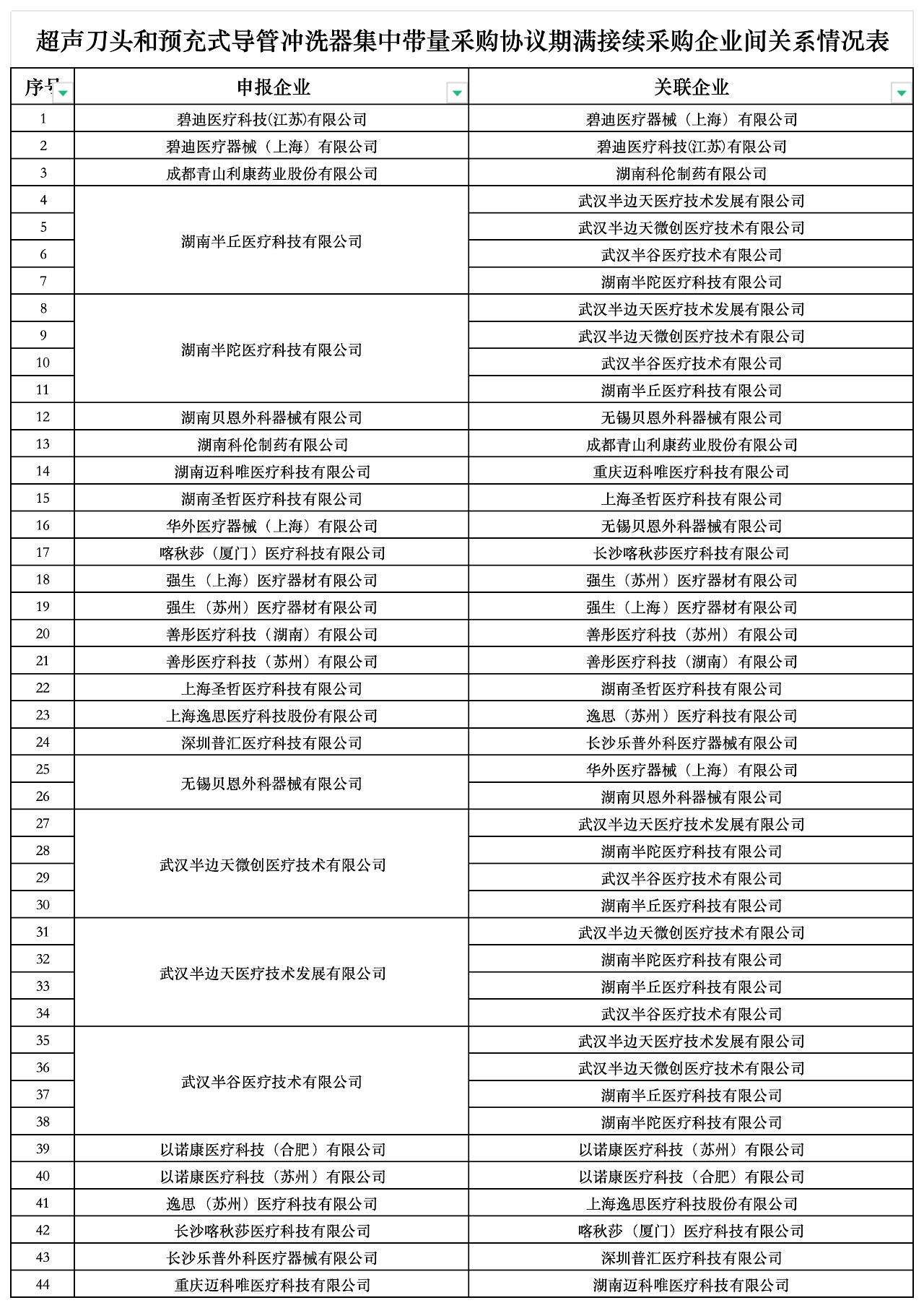 12月12日,深圳公共資源交易中心發(fā)布《深圳公共資源交易中心關(guān)于公示超聲刀頭和預(yù)充式導(dǎo)管沖洗器集中帶量采購協(xié)議期滿接續(xù)采購企業(yè)間關(guān)系的通知》(名單見文末),于2024年12月12日-2024年12月17日17:00進(jìn)行公示。