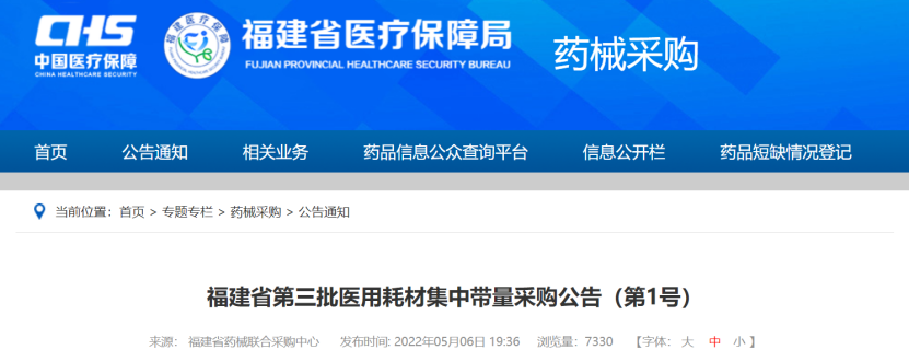 5月6日,福建省醫(yī)保局發(fā)布《福建省第三批醫(yī)用耗材集中帶量采購公告(第1號)》,將對冠脈導引導管類、冠脈導引導絲類、彈簧圈類、壓力泵類、圈套器(息肉勒除器)等5種耗材開展集中帶量采購。