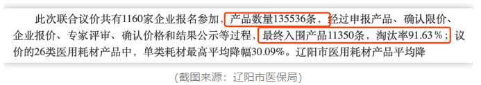 6月8日,遼陽市醫(yī)保局官網(wǎng)發(fā)布“遼陽市·營口市醫(yī)療衛(wèi)生機(jī)構(gòu)2020年醫(yī)用耗材聯(lián)合議價項目”的結(jié)果,內(nèi)容顯示:本次共有1100余家企業(yè)參與報名,產(chǎn)品數(shù)量13萬余件,但最終入圍的產(chǎn)品僅有1.1萬余件,淘汰率接近92%。