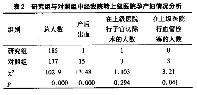 根據(jù)三級(jí)轉(zhuǎn)診制度和孕產(chǎn)婦知情同意的情況下,研究組和對(duì)照組中經(jīng)我院轉(zhuǎn)廣州上級(jí)醫(yī)院的共362人,因“產(chǎn)后出血”轉(zhuǎn)診的有16名產(chǎn)婦,在上級(jí)醫(yī)院行急診子宮切除的為4人,行血管栓塞的為3人。研究組中轉(zhuǎn)診率明顯高于對(duì)照組,(x²=102.9,P=0.oo);研究組中產(chǎn)后出血轉(zhuǎn)診率明顯低于對(duì)照組,(x²=13.48,P=0.000);在上級(jí)醫(yī)院行血管栓塞的發(fā)生率研究組中明顯低于對(duì)照組,(x²=3.21,P=0.041),見表2。