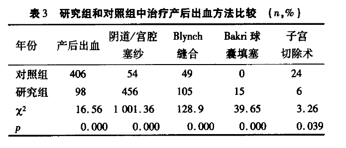 研究組中陰道/宮腔塞紗術(shù)明顯高于對(duì)照組,(x²=1001.36,p=0.000);Bakri球囊填塞術(shù)明顯高于對(duì)照組,(x²=39.65,P=0.00);研究組中產(chǎn)后出血發(fā)生率、產(chǎn)科急診子宮切除率明顯低于對(duì)照組,(x²=16.56、3.26,P=0.000、0.029),均P<0.05,見表3。