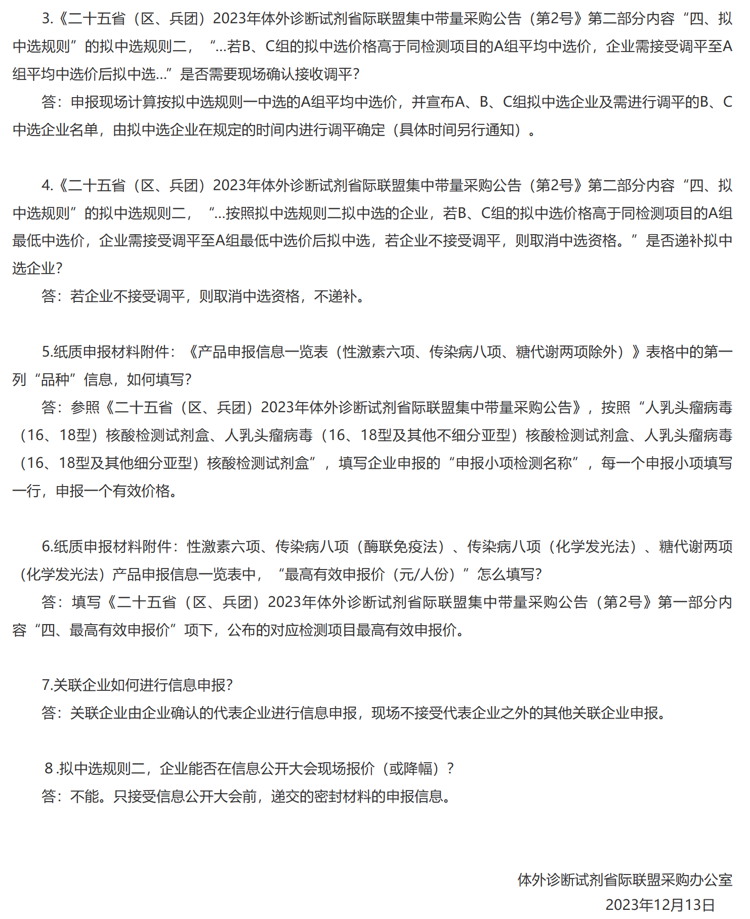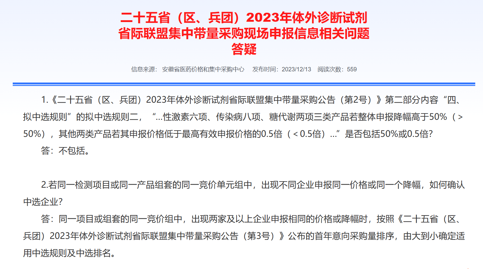 同日,安徽省醫(yī)藥價(jià)格和集中采購(gòu)中心還發(fā)布了《二十五省(區(qū)、兵團(tuán))2023年體外診斷試劑省際聯(lián)盟集中帶量采購(gòu)現(xiàn)場(chǎng)申報(bào)信息相關(guān)問(wèn)題答疑》(完整內(nèi)容附文末)。
