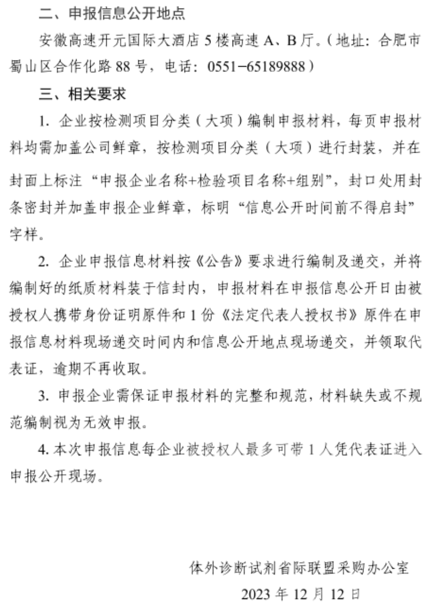 根據(jù)《通知》內(nèi)容,二十五省(區(qū)、兵團(tuán))2023年體外診斷試劑省際聯(lián)盟集中帶量采購(gòu)申報(bào)信息公開(kāi)大會(huì)將在安徽高速開(kāi)元國(guó)際大酒店5樓高速A、B廳舉行,申報(bào)信息材料現(xiàn)場(chǎng)遞交時(shí)間確定為2023年12月20日上午8:00-8:50,申報(bào)信息公開(kāi)時(shí)間為同日上午9:20。