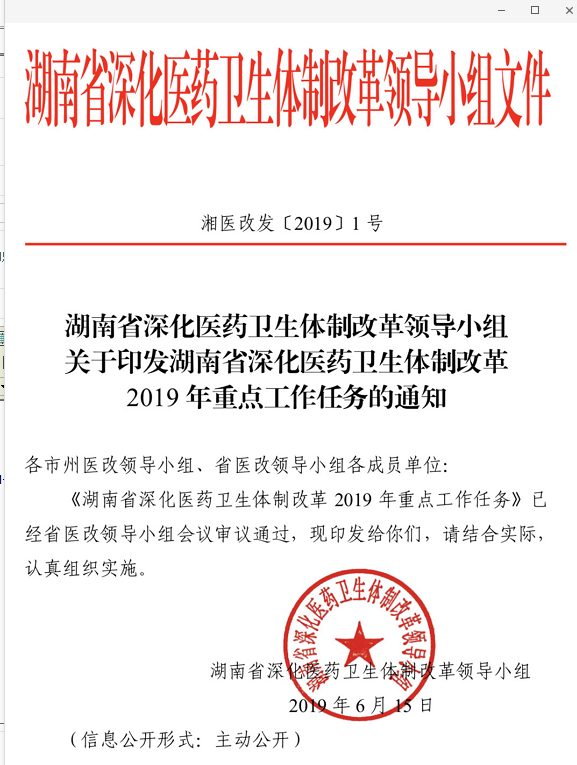 7月2日,湖南省衛(wèi)健委發(fā)布《深化醫(yī)藥衛(wèi)生體制改革2019年重點(diǎn)工作任務(wù)》(湘醫(yī)改發(fā)〔2019〕1號(hào))的文件。