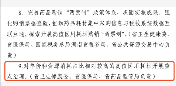 文件中特別強(qiáng)調(diào),將對(duì)單價(jià)和資源消耗占比相對(duì)較高的高值醫(yī)用耗材開展重點(diǎn)治理。由省衛(wèi)生健康委、省醫(yī)保局、省藥品監(jiān)管局負(fù)責(zé)。