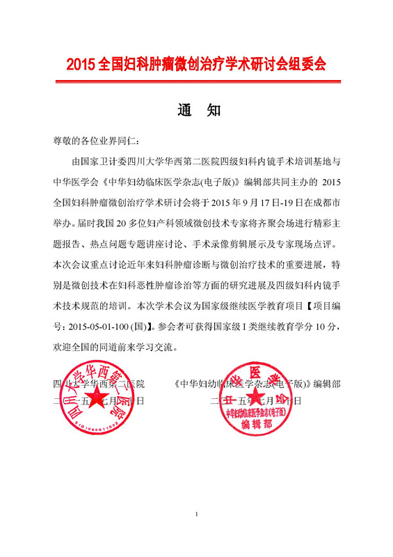 由國家衛(wèi)計(jì)委四川大學(xué)華西第二醫(yī)院四級(jí)婦科內(nèi)鏡手術(shù)培訓(xùn)基地與中華醫(yī)學(xué)會(huì)《中華婦幼臨床醫(yī)學(xué)雜志(電子版)》編輯部共同主辦的2015全國婦科腫瘤微創(chuàng)治療學(xué)術(shù)研討會(huì)將于2015年9月17日-19日在成都市舉辦。屆時(shí)我國20多位婦產(chǎn)科領(lǐng)域微創(chuàng)技術(shù)專家將齊聚會(huì)場進(jìn)行精彩主題報(bào)告、熱點(diǎn)問題專題講座討論、手術(shù)錄像剪輯展示及專家現(xiàn)場點(diǎn)評(píng)。
