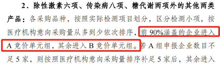 不能滿足組套檢測項目品種齊全的,作為C競價單元組,根據(jù)企業(yè)報價由低到高或降幅由高到低進行排名,確定中選產(chǎn)品,實施帶量采購及執(zhí)行相關(guān)配套政策。