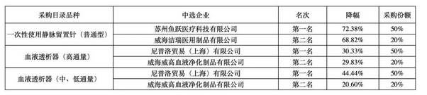血液透析器(中、低通量))有兩家中選企業(yè),分別是:尼普洛貿(mào)易(上海)有限公司、威海威高血液凈化制品有限公司;