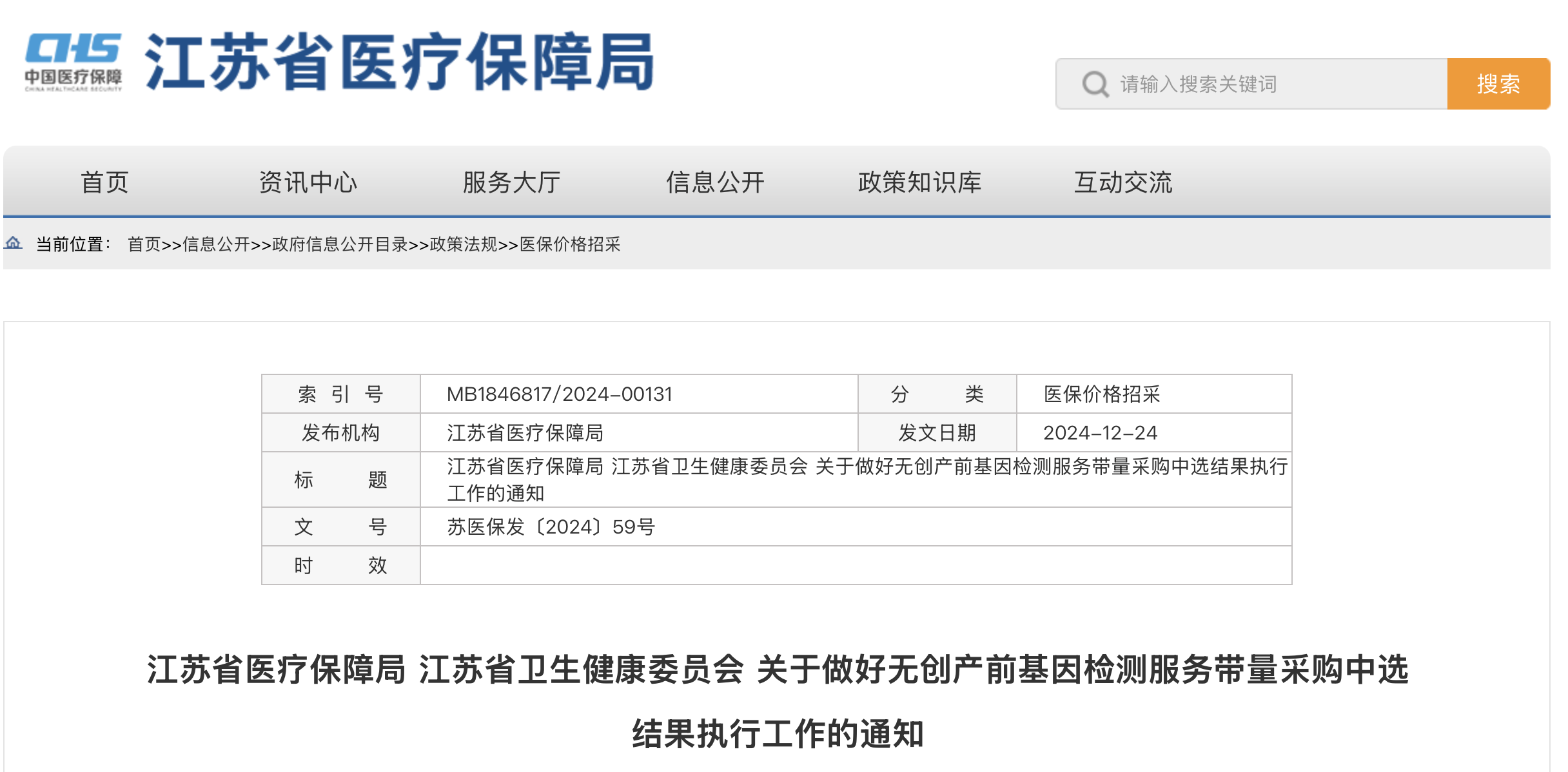 近日,江蘇醫(yī)保局發(fā)布《江蘇省醫(yī)療保障局江蘇省衛(wèi)生健康委員會(huì) 關(guān)于做好無創(chuàng)產(chǎn)前基因檢測(cè)服務(wù)帶量采購(gòu)中選結(jié)果執(zhí)行工作的通知》,于2025年1月1日起執(zhí)行本次無創(chuàng)產(chǎn)前基因檢測(cè)服務(wù)帶量采購(gòu)中選結(jié)果,執(zhí)行期暫定為2年。