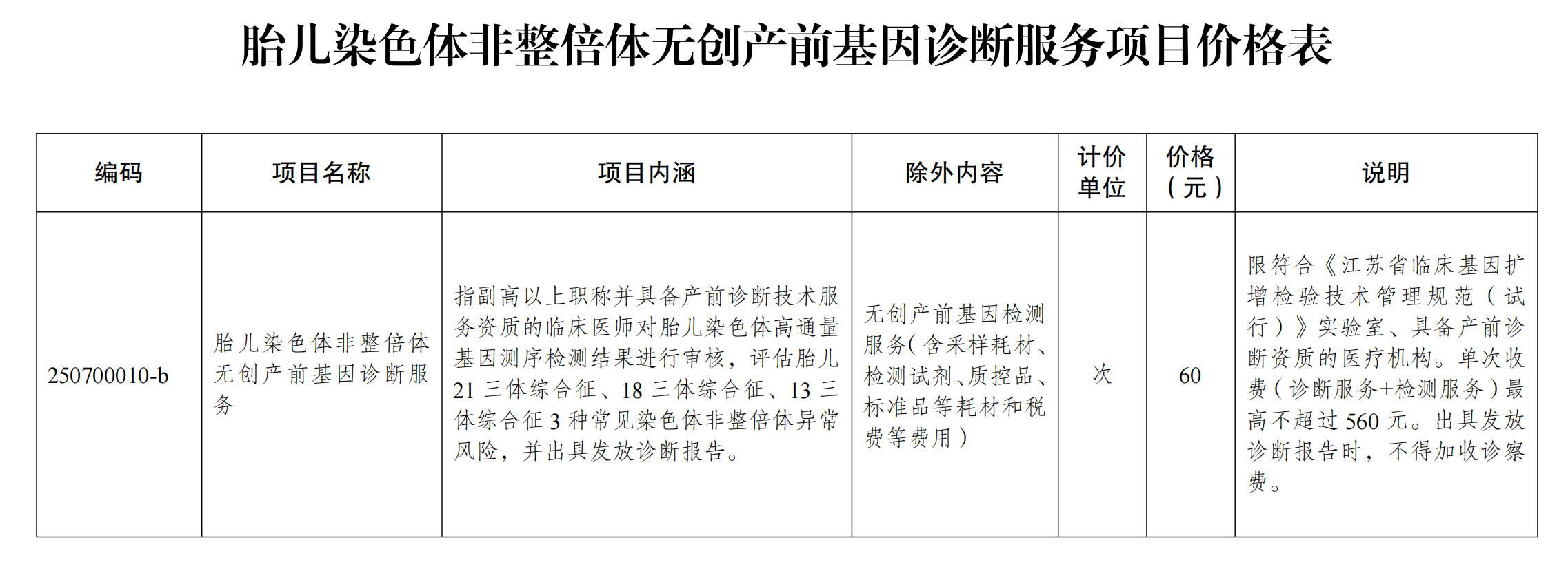 無創(chuàng)產(chǎn)前基因檢測(cè)按照“檢測(cè)服務(wù)+診斷服務(wù)”方式收取費(fèi)用,診斷服務(wù)最高政府指導(dǎo)價(jià)為60元/次,檢測(cè)服務(wù)按集采中選結(jié)果執(zhí)行,單次收費(fèi)最高不超過560元。醫(yī)療機(jī)構(gòu)出具診斷報(bào)告時(shí),不得再加收診察費(fèi)。省內(nèi)產(chǎn)前診斷機(jī)構(gòu)以及符合衛(wèi)生健康部門規(guī)定與產(chǎn)前診斷機(jī)構(gòu)建立合作機(jī)制的產(chǎn)前篩查機(jī)構(gòu),應(yīng)規(guī)范開展無創(chuàng)產(chǎn)前基因檢測(cè)服務(wù)并收取費(fèi)用。