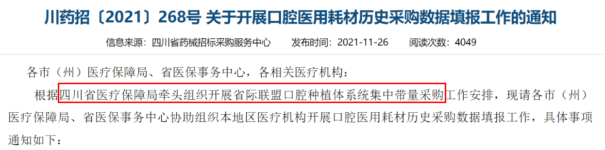 2021年11月17日,四川省藥械招標(biāo)采購(gòu)服務(wù)中心發(fā)布《關(guān)于開展部分口腔類高值醫(yī)用耗材產(chǎn)品信息采集工作的通知》。