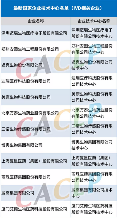 截至目前,已經(jīng)超過1500家企業(yè)被認(rèn)定為國家企業(yè)技術(shù)中心,根據(jù)CACLP統(tǒng)計(jì),加上擬認(rèn)定的2家企業(yè),已有12家體外診斷相關(guān)企業(yè)列入"國家企業(yè)技術(shù)中心"名單。