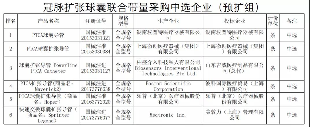 預(yù)擴(kuò)組冠脈擴(kuò)張球囊中選企業(yè)包括湖南埃普特、上海微創(chuàng)、吉威醫(yī)療、波科、樂普、美敦力。