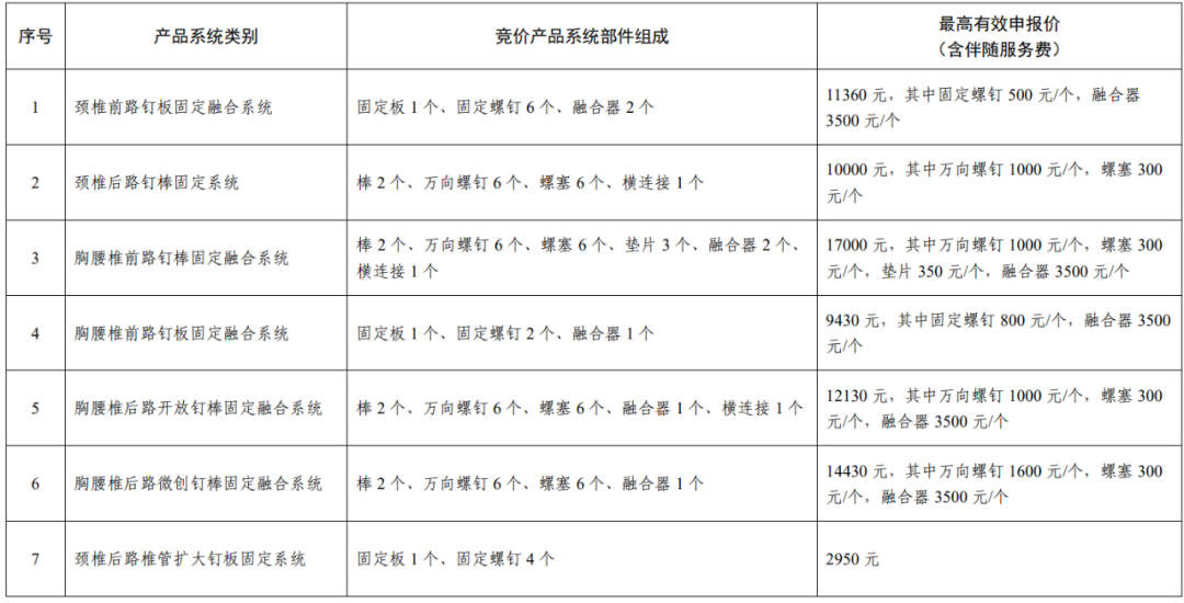 本次集采中,各產(chǎn)品系統(tǒng)類別主要部件按如下規(guī)則組成競價產(chǎn)品系統(tǒng),對應(yīng)最高有效申報價(含伴隨服務(wù)費,骨水泥除外)如下: