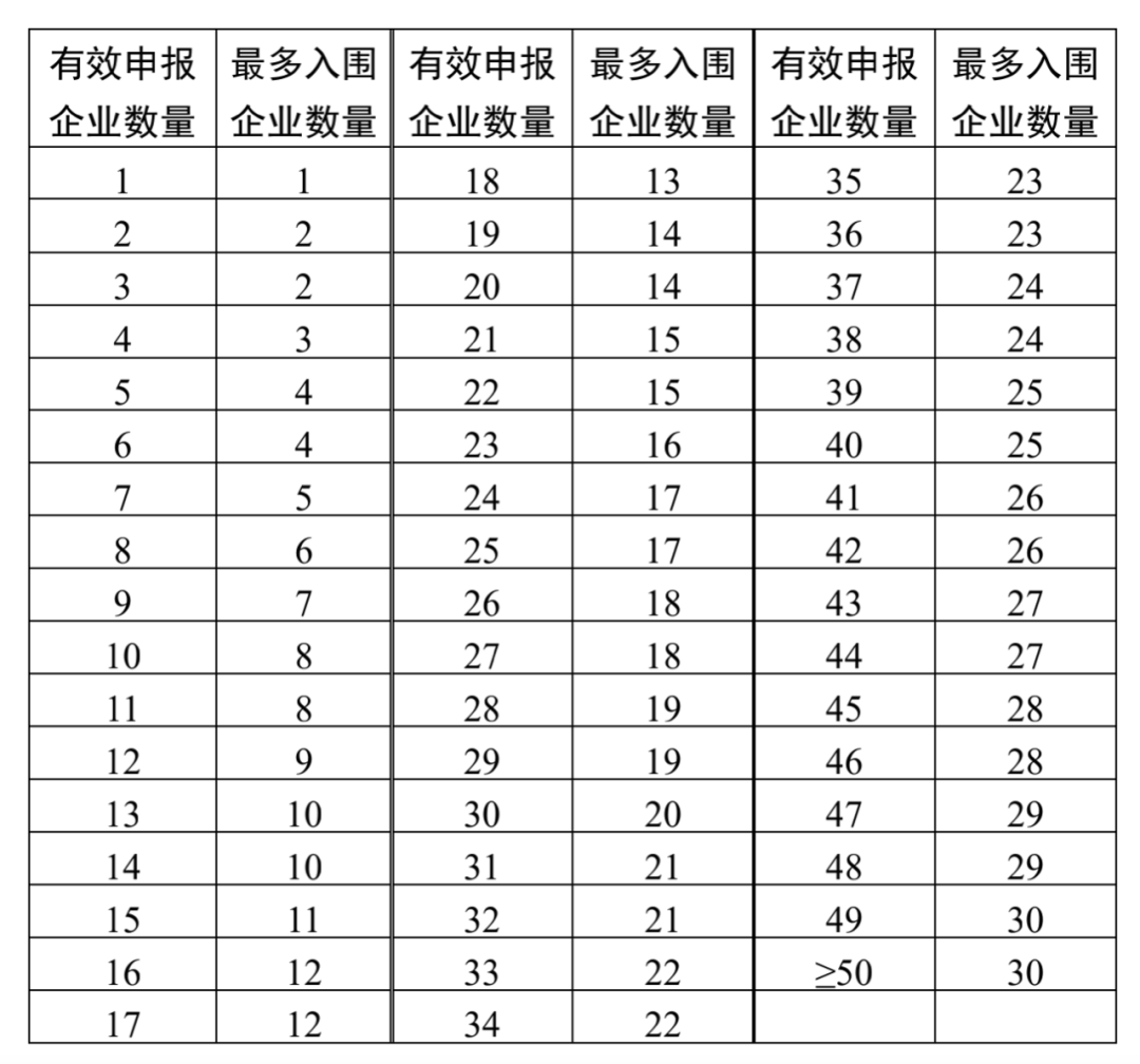 規(guī)則一:A、B 競價單元內(nèi),分別按有效申報企業(yè)競價比價價格由低到高排序,確定入圍企業(yè)。入圍企業(yè)的競價產(chǎn)品系統(tǒng)競價比價價格不高于相應(yīng)最高有效申報價。最多入圍企業(yè)數(shù)量如下: