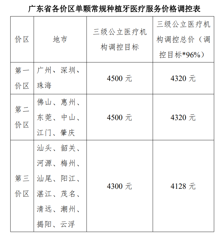 例如,廣東省制定口腔種植類醫(yī)療服務(wù)價格項目基準(zhǔn)價,將全省21個地市分為3個價區(qū),基準(zhǔn)價為第二價區(qū)最高指導(dǎo)價(允許放寬情形除外),第一價區(qū)可在規(guī)定的基準(zhǔn)價基礎(chǔ)上適當(dāng)上浮5%-20%,第二價區(qū)可下浮,第三價區(qū)至少下浮5%。