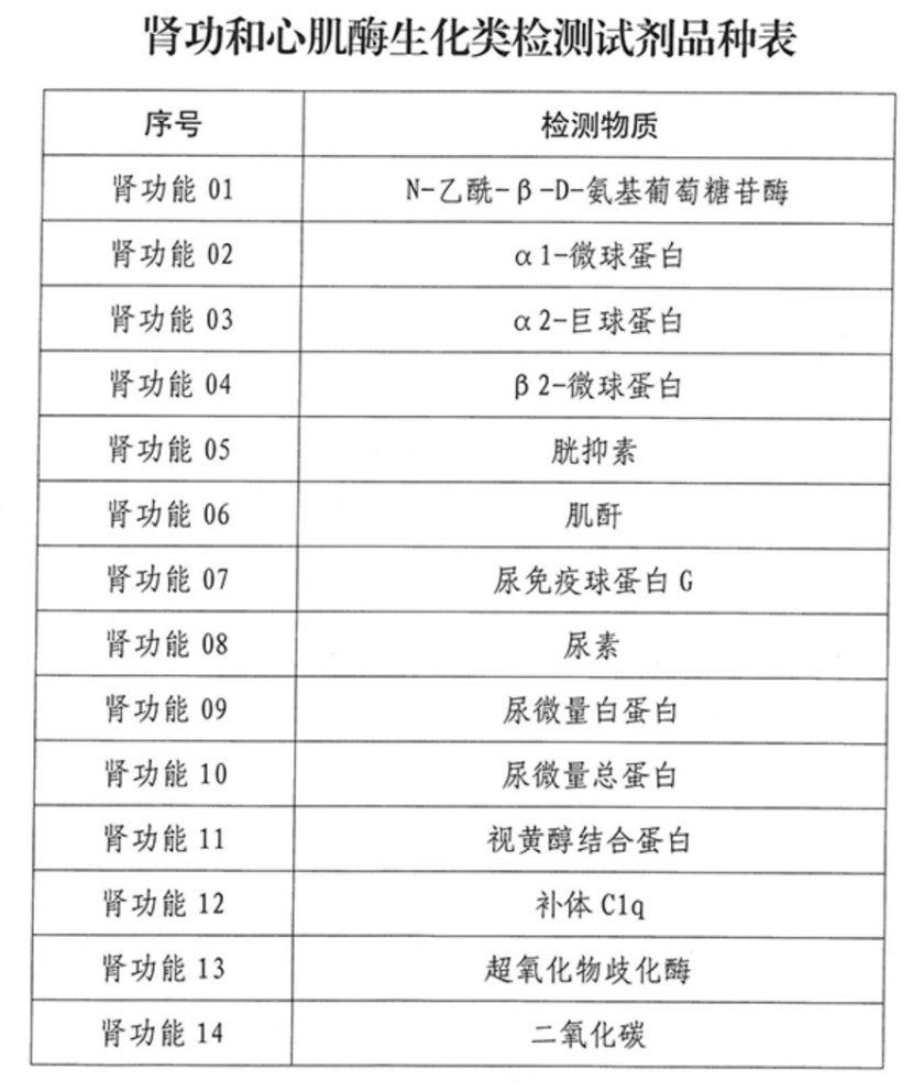 品種范圍包括腎功和心肌酶生化類檢測試劑,具體包括16種腎功生化試劑和13種心肌酶生化試劑,共29個品種。