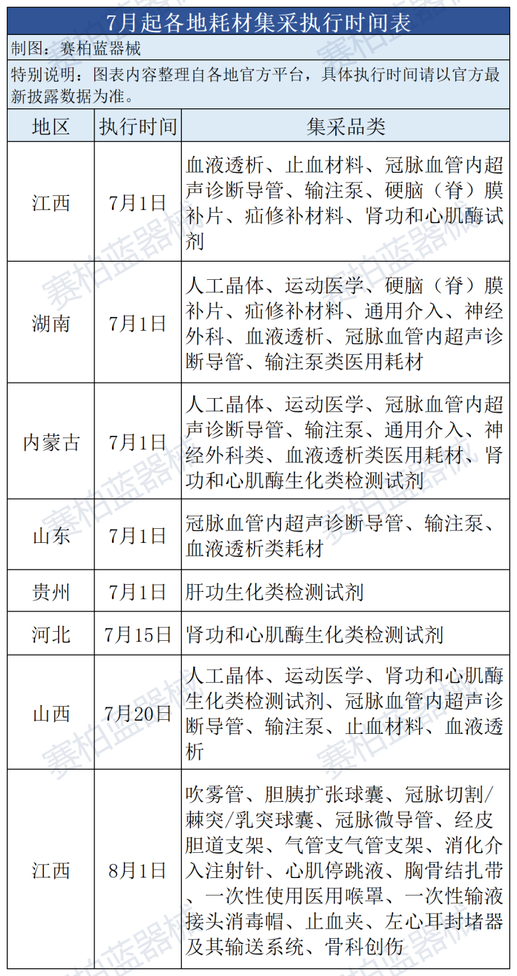 據(jù)賽柏藍(lán)器械梳理,7月起,江西、湖南、內(nèi)蒙古、山西、河北、貴州、山東等地將陸續(xù)執(zhí)行多類(lèi)耗材集采結(jié)果,耗材降價(jià)鏈條持續(xù)震蕩。