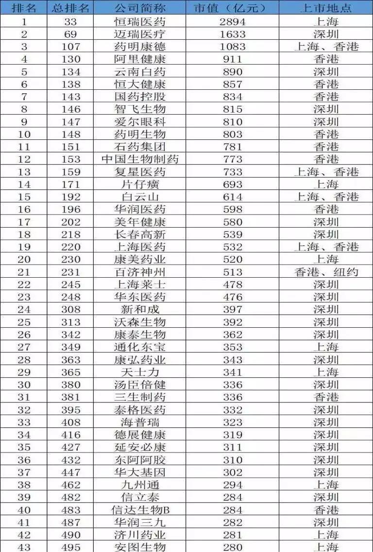 在這次排名中,共計(jì)43家醫(yī)藥相關(guān)的企業(yè)入圍,總市值達(dá)到了25822億元,占所有500強(qiáng)企業(yè)總市值的3%。