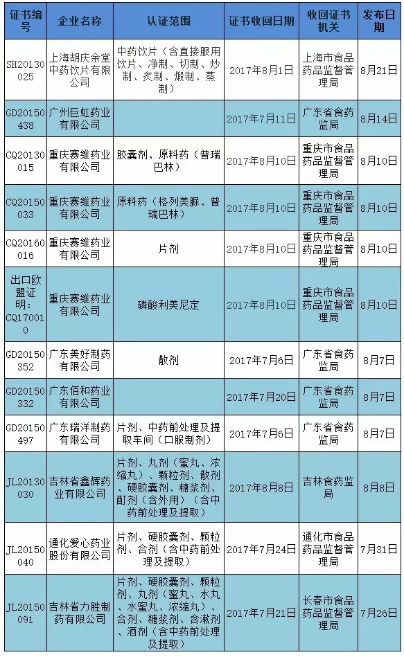 和以往不同的是,這一批證書被收回的藥企中,飲片公司只有1家。如此看來,是前一段全國上下的中藥飲片專項檢查,起了作用。證書被收回,經(jīng)過整改再驗收和合格后,就會發(fā)回。這個過程也可能很快,海南食藥監(jiān)局曾在7月27日將一家藥企的證書收回,到8月17日,就發(fā)布公告發(fā)回了。