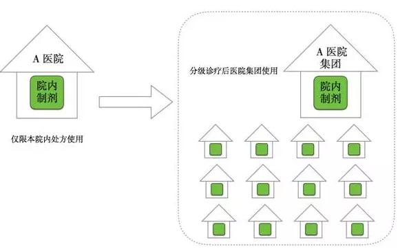 1、 分級診療的推行,醫(yī)院開始集團化,在上級醫(yī)院治療、在下級醫(yī)院康復,那么院內(nèi)制劑不限于一家醫(yī)院來處方,在整個醫(yī)院集團內(nèi)使用。很可能在網(wǎng)絡內(nèi)的社區(qū)醫(yī)院都可以使用原先在大醫(yī)院才能處方的優(yōu)質的院內(nèi)制劑藥品。