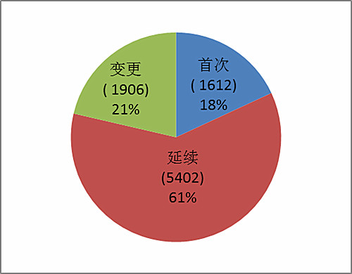 按照注冊式形區(qū)分,首次注冊1966項占全部注冊的23%,延續(xù)注冊5221項占全部注冊申請的60%,許可事項變更注冊1466項占全部注冊申請的17%。注冊形式比例情況見圖6。